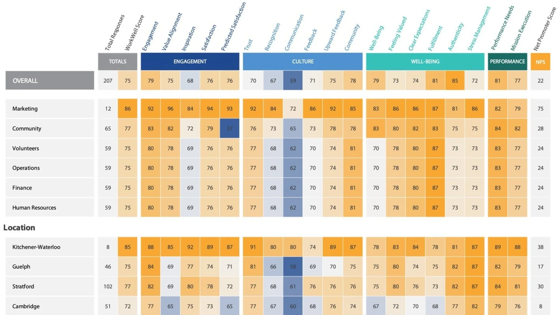 Our extensive heat maps present all of your data in one place to highlight key differences across teams, locations, positions, tenure, and demographics to identify where your efforts will be best spent.